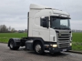 Number of axles: 2, Configuration: 4x2, Own weight: 8040 kg, Gross vehicle weight: 18600 kg, Total fuel capacity: 700 litre, Fifth wheel height: 118 cm, fifth-wheel: Fixed, Diff. locks: 1, Suspension type: air suspension, Cabin type: Highline, Cruise control, Tacho, Digital tachograph, Airconditioning, Parking heater, Color: white, Lighting type: Halogen lamps, Engine capacity: 309 Kw (414 Hp), Fuel type: diesel, Euro: 5, Gearbox kind: Opti-cruise, Gearbox make: Scania, Number of Gears: 12, Add. break system, Retarder make: Scania, Power steering, ABS, ASR, Starter battery, Seats configuration: 1+1, Seat cover: cloth, Chair adjustment: Manually